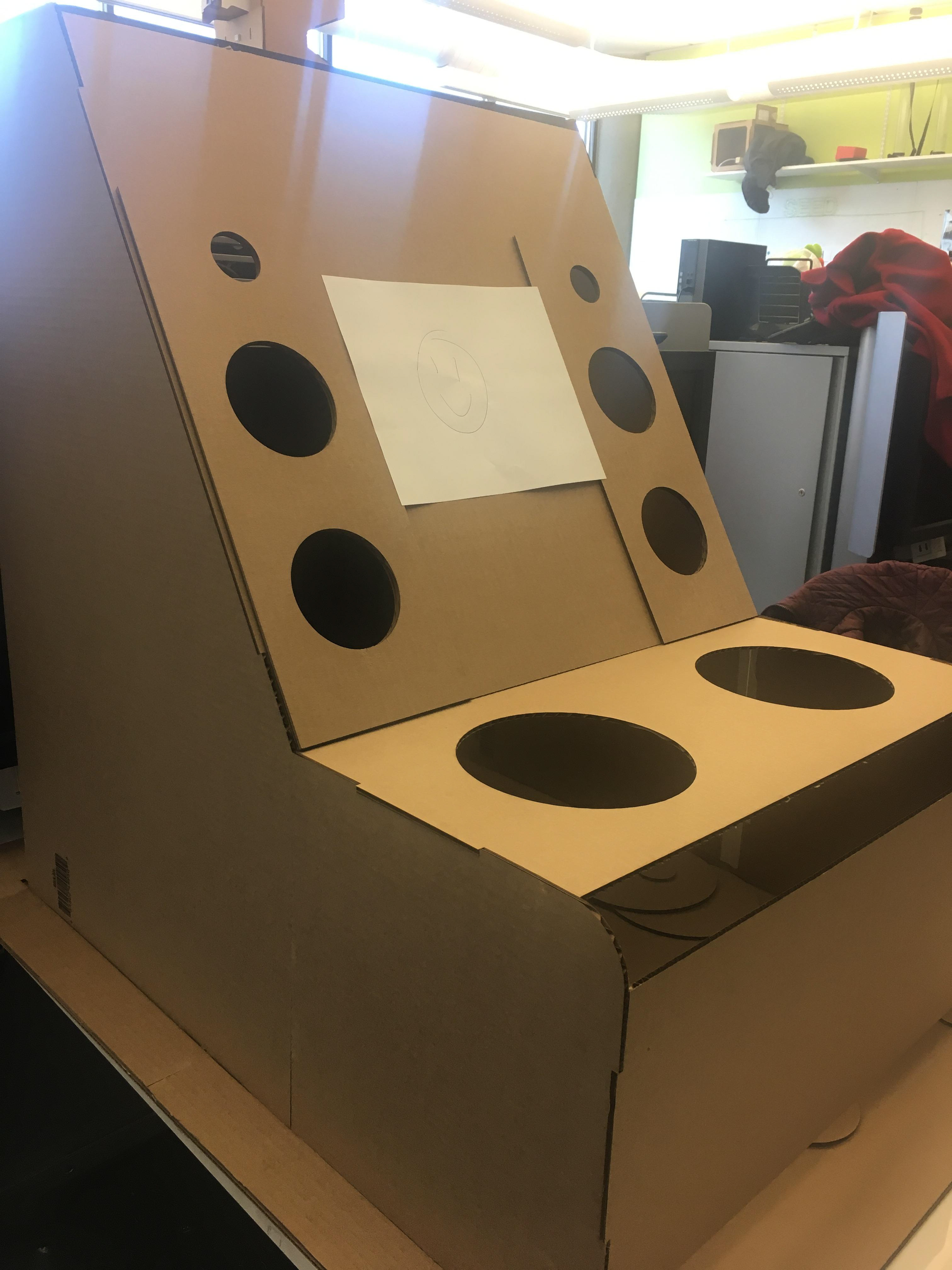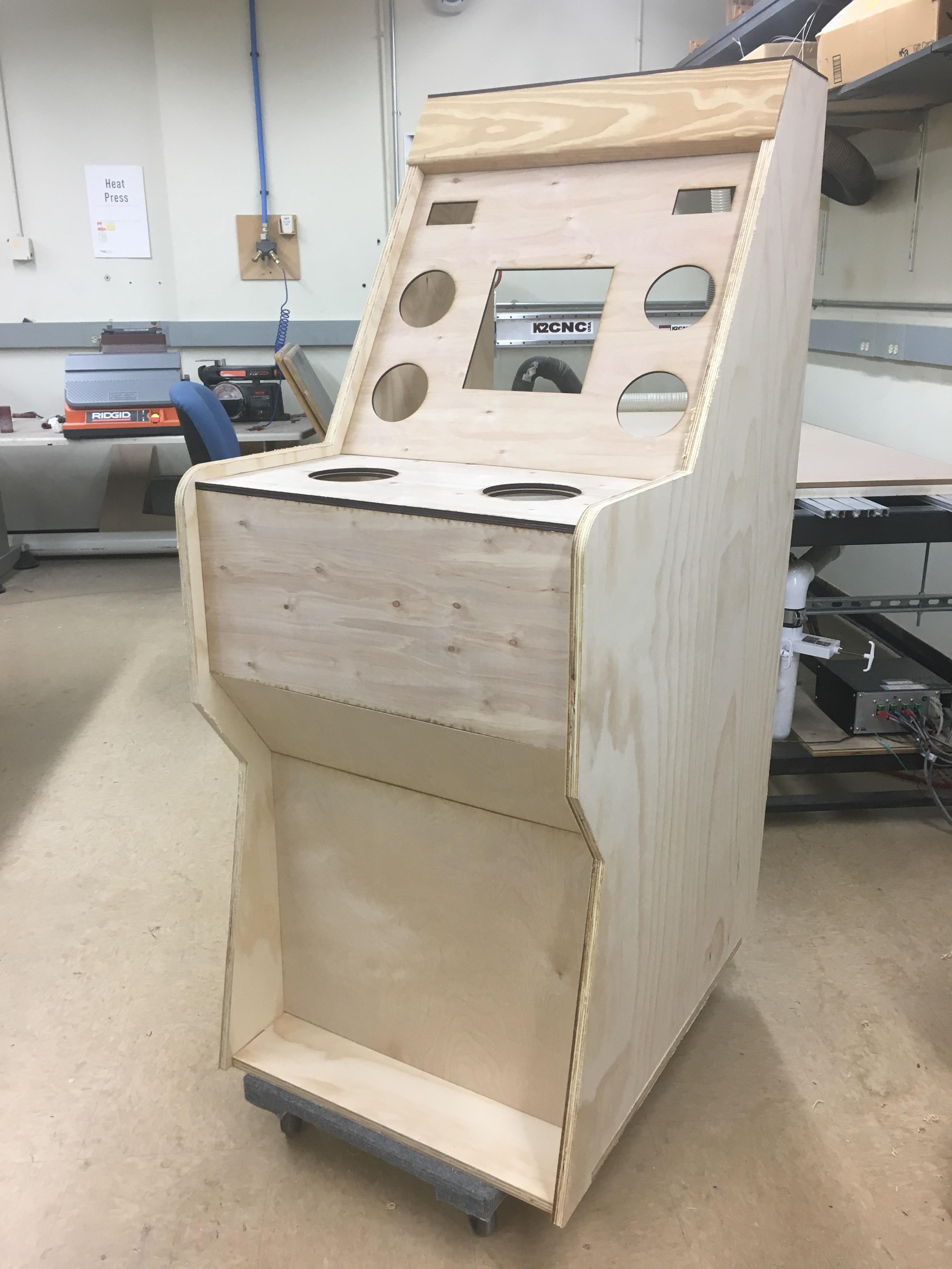 We designed the machine to resemble an arcade machine, but designed the interior, underside to be easily replaceable and interior top side to allow room for electronics. In this design, we also created our interactive electronics requirements. All that was left to finalize was the screen.