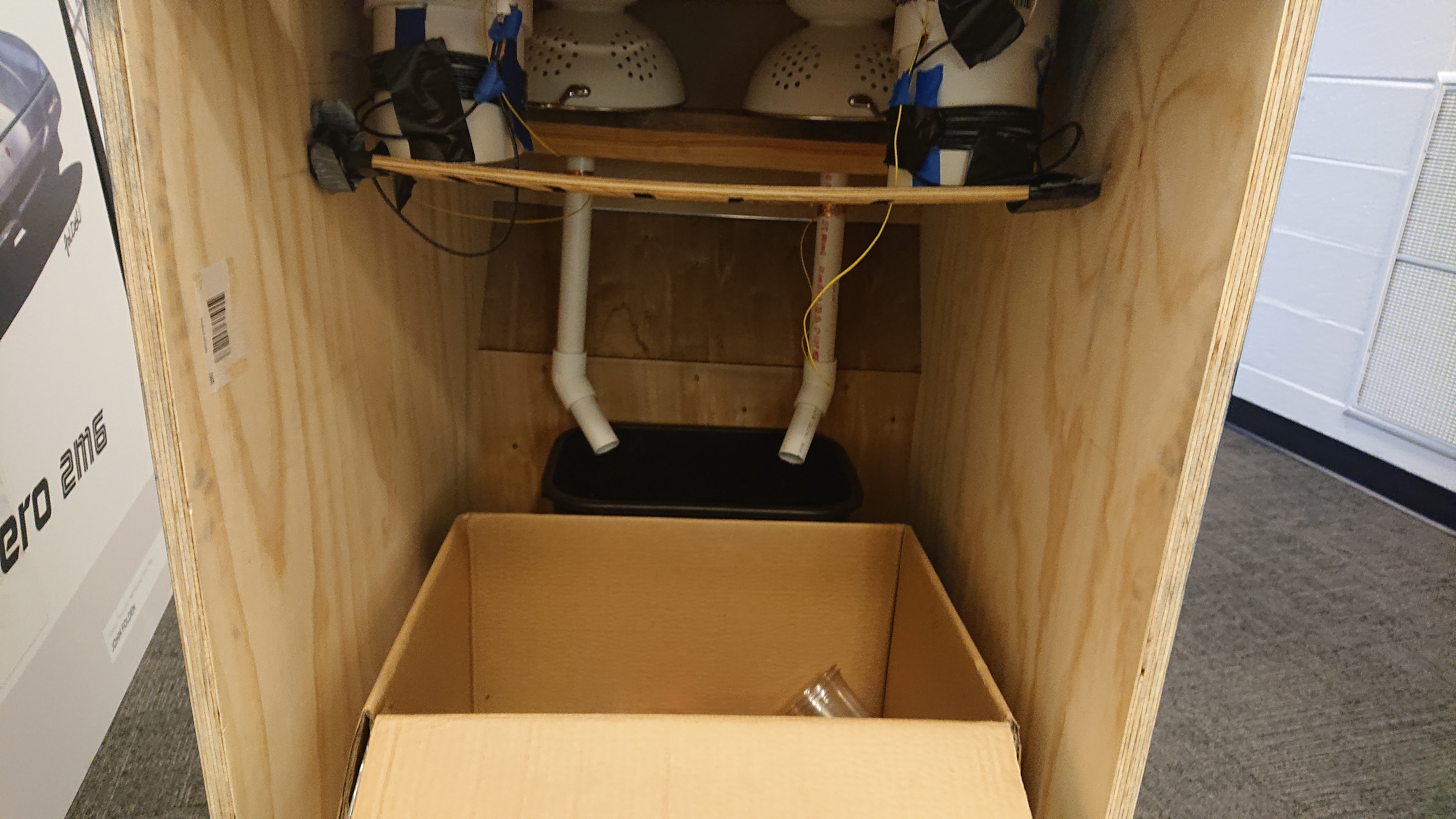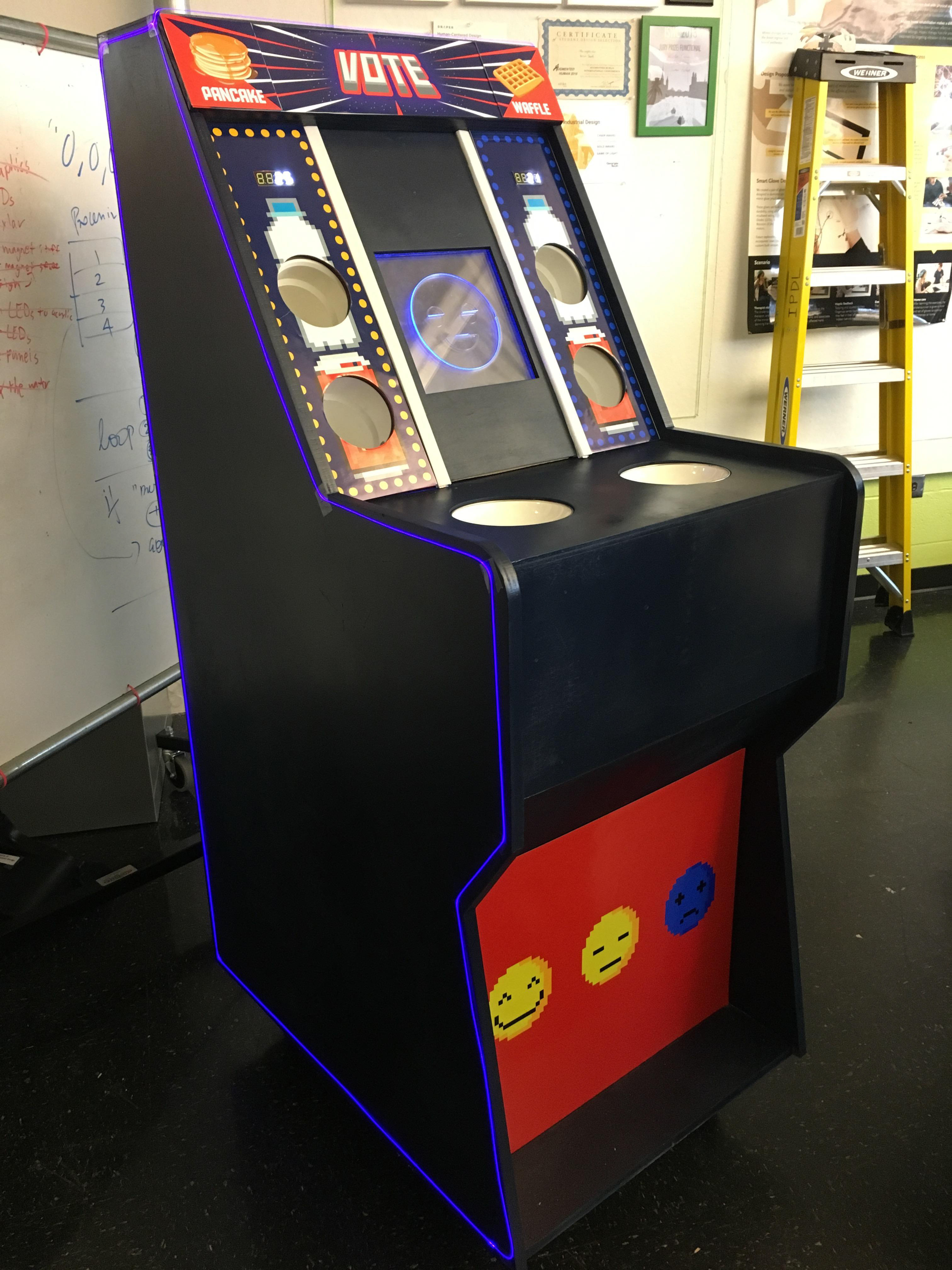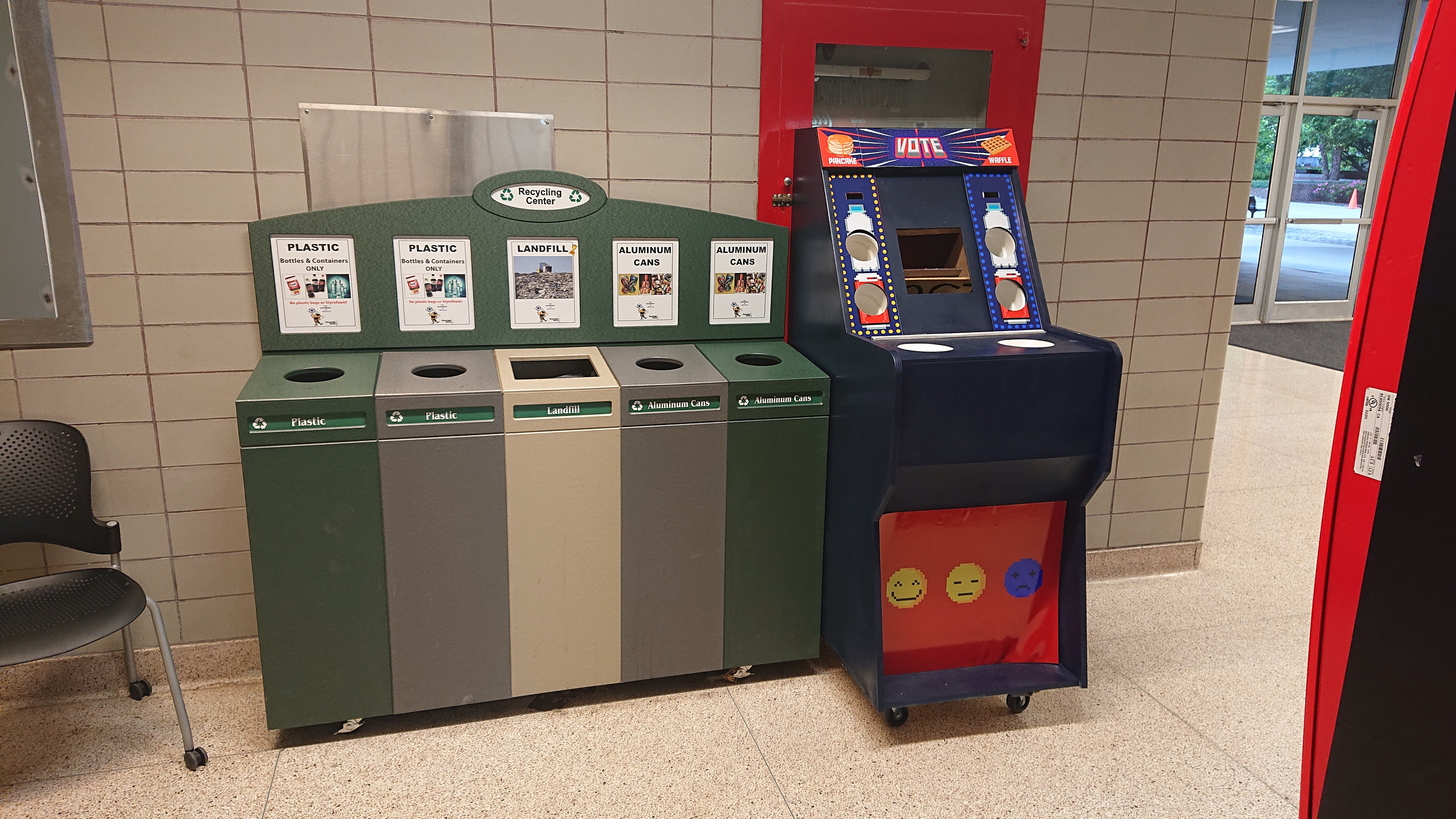 Embracing this challenge, we went through the human centered design process with a focus on elements of play to create an environmental experience. Through a user centered design and prototyping process, we created an arcade machine with a simple question with feedback. Users recycle their can or bottle and score bonus points for their vote by emptying their drinks in the funnel. With arcade themed audio and visual feedback, we created a delightful experience users would excitedly use to vote for their side.