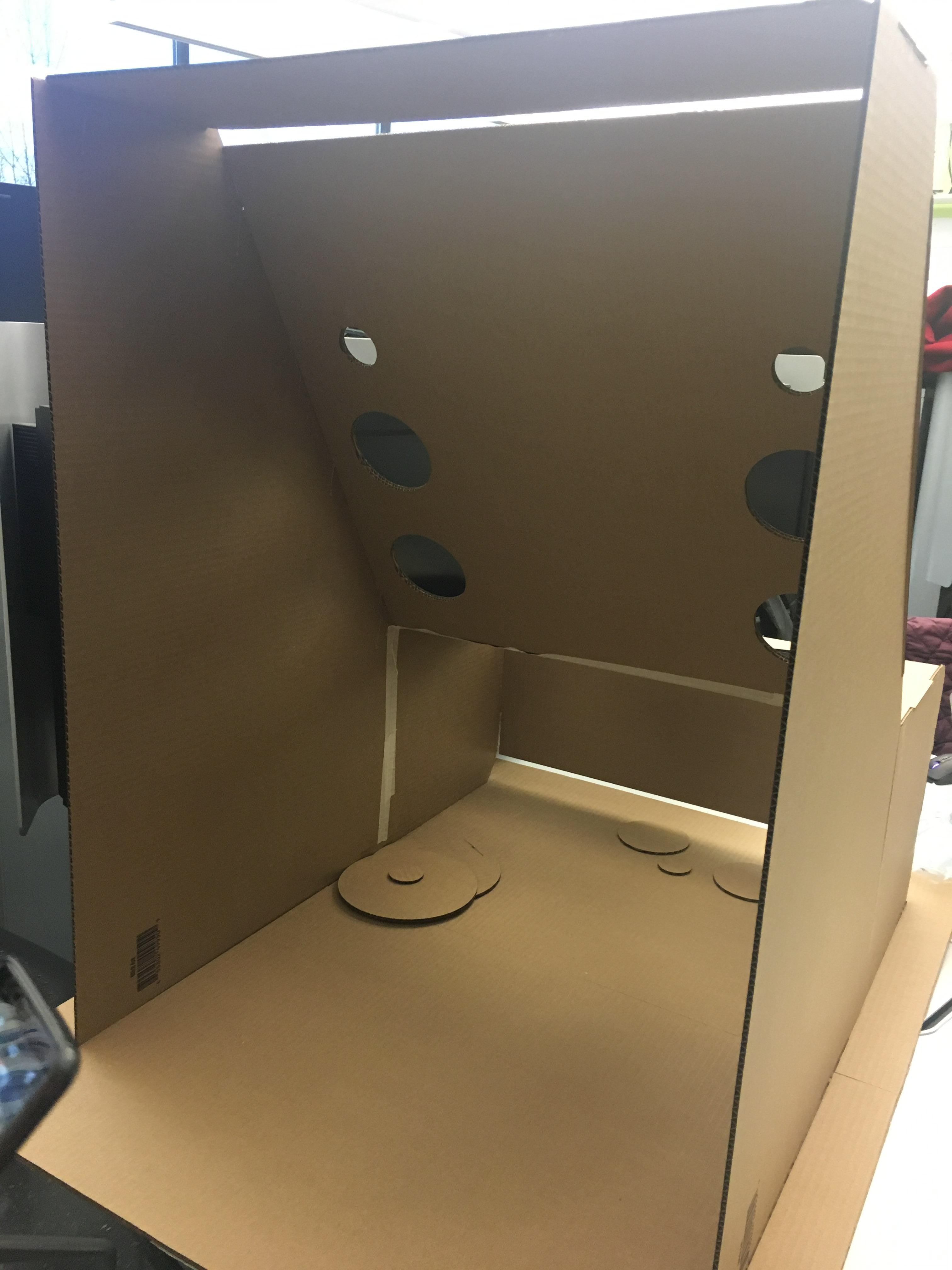 A quick cardboard model was made at 1:1 scale to help us begin testing final dimensions and have a test unit to prototype sensors on during the rest of the build process.