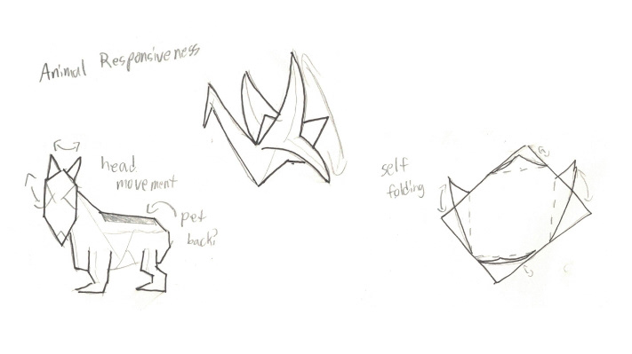 Ultimately, despite not having a prototype, the motion origami was the most inspiring concept that was also feasible to complete within the time limit of the project. The final concept would be a paper crane that flaps its wings in response to touching its neck.