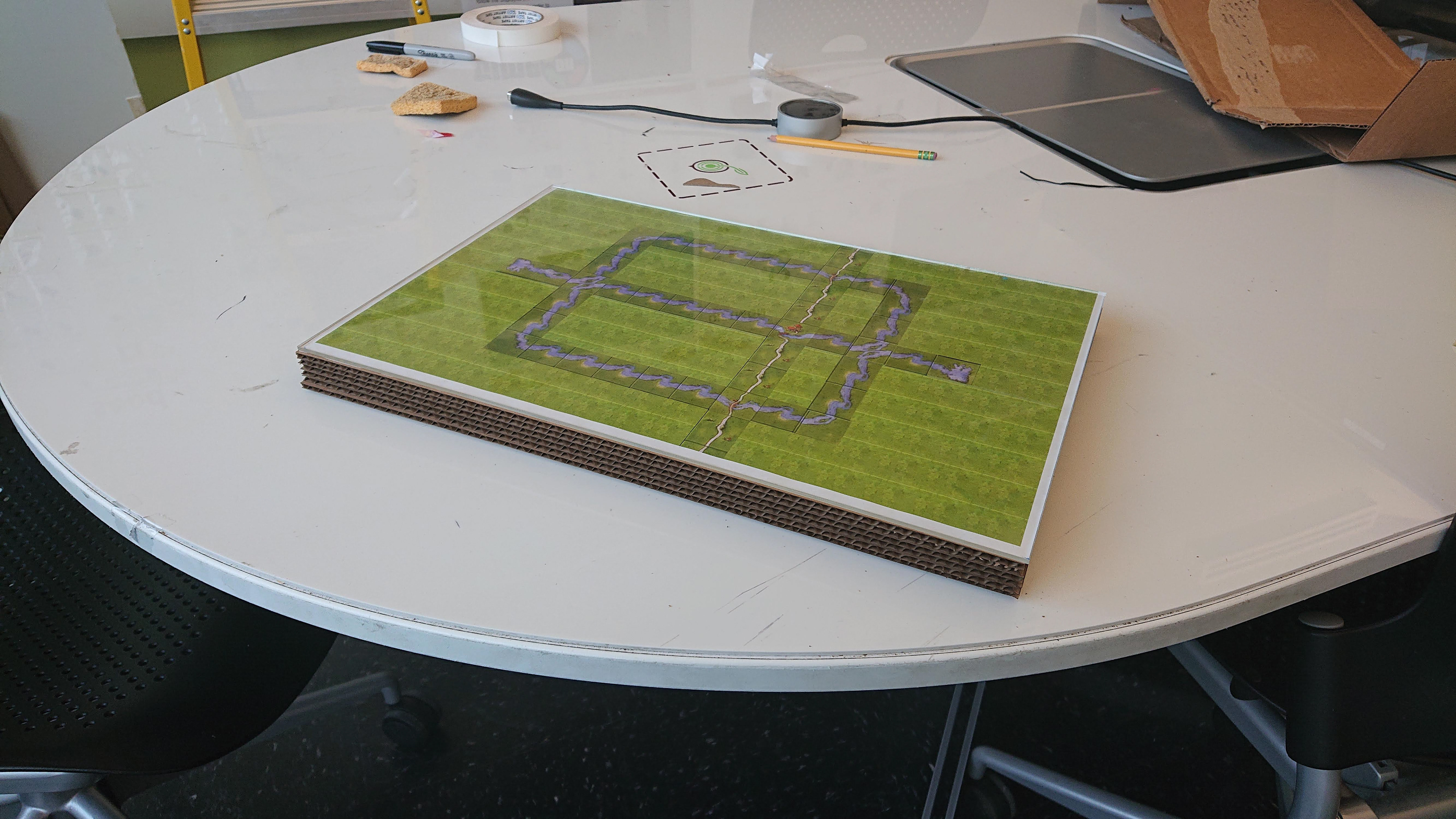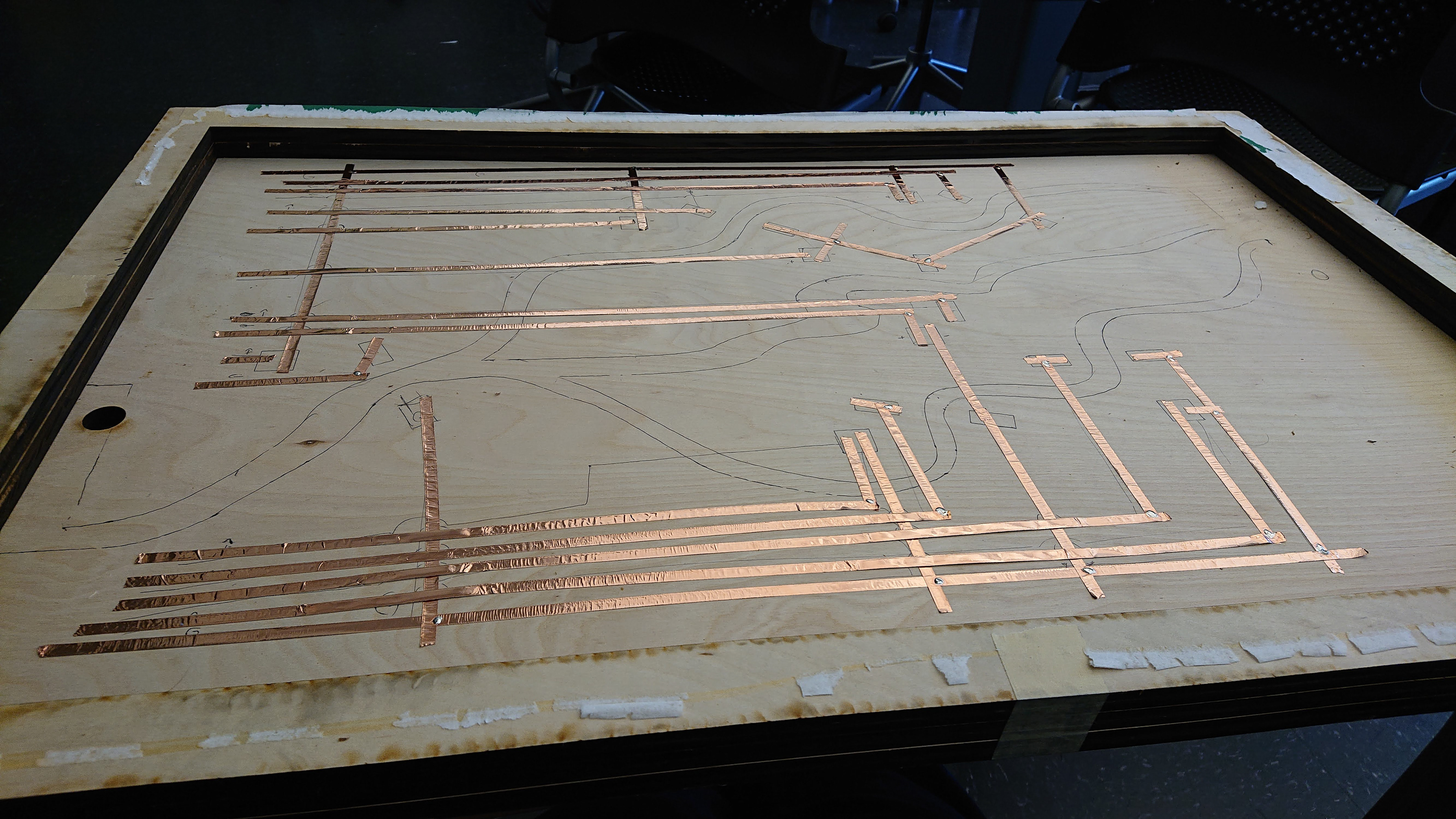Recycling from our previous prototype, we replaced the cardboard with a overlay and river design. This continued to allow room for refinement as well as individual accessibility for each component. We began by creating an initial circuit from copper tape on the bottom layer of the table. This allowed for flexibility in prototyping as well as minimal footprint in such a tight space.