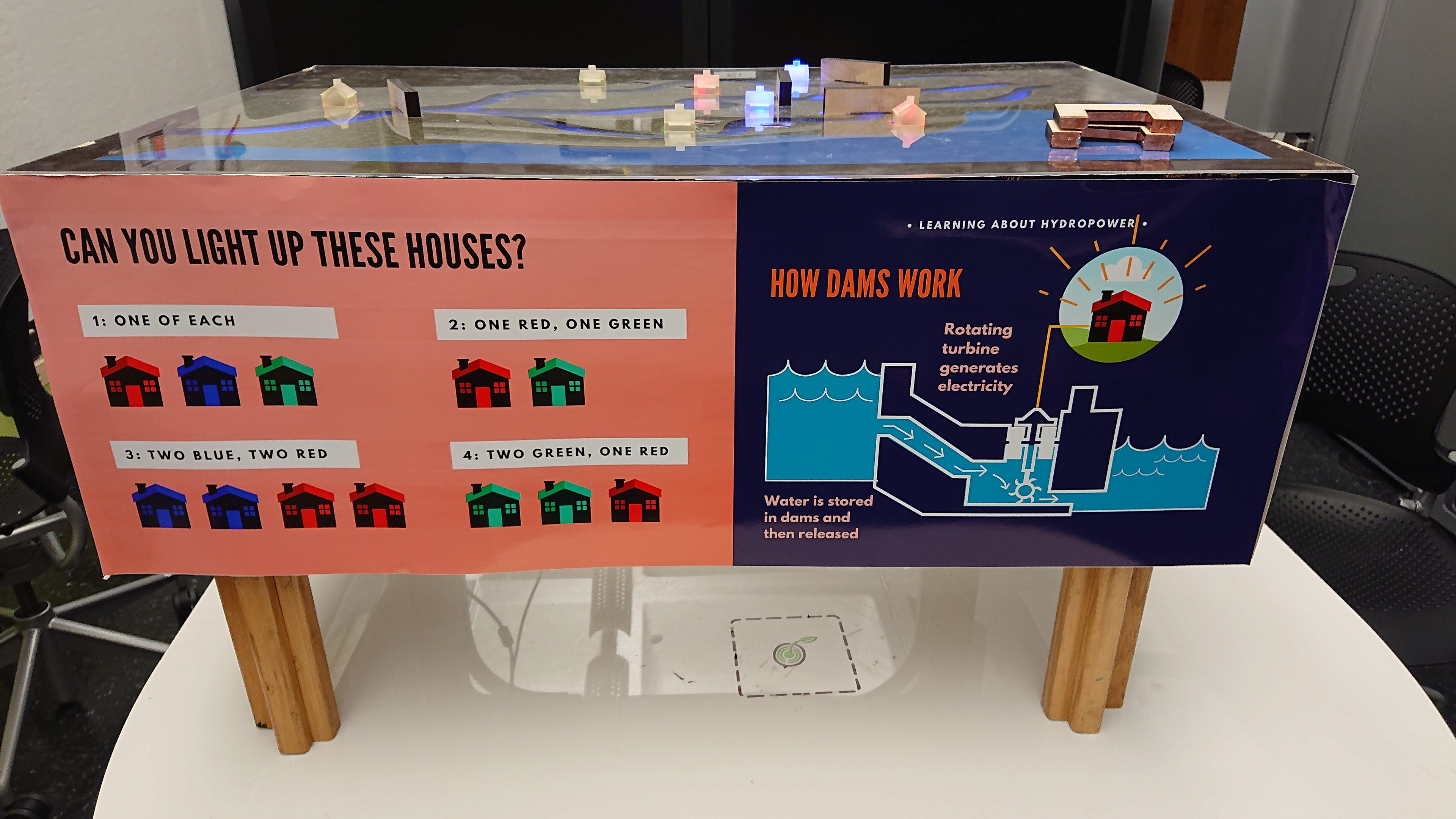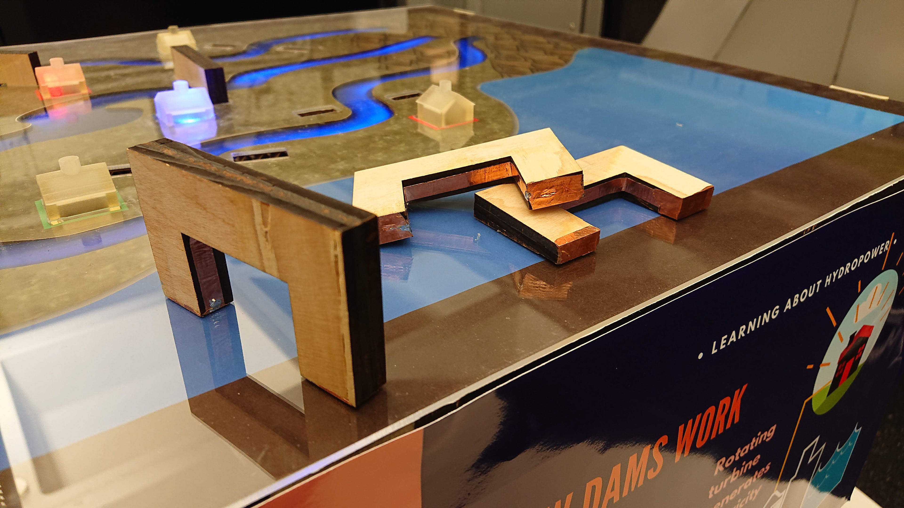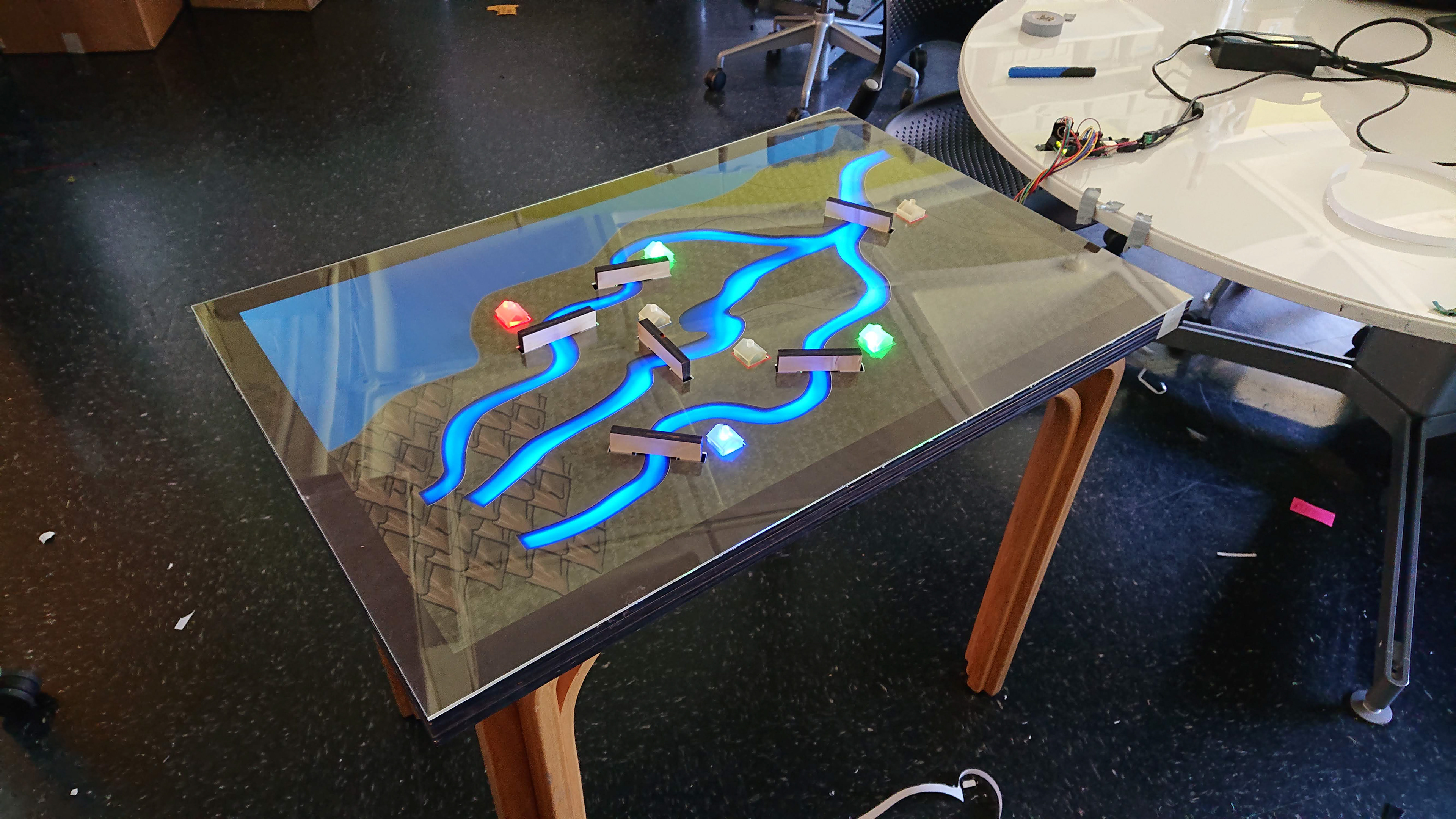 We created a mid-fidelity "acts like" prototype using a plywood and cardboard structure powered by an Arduino and custom touch sensors hidden underneath basic graphics. We used colored acrylic and LED strips for the river animations that acted as the primary output and attract. With this fabrication style, we could easily replace any digital components in future iterations while maintaining the integrity of the physical table and frame.