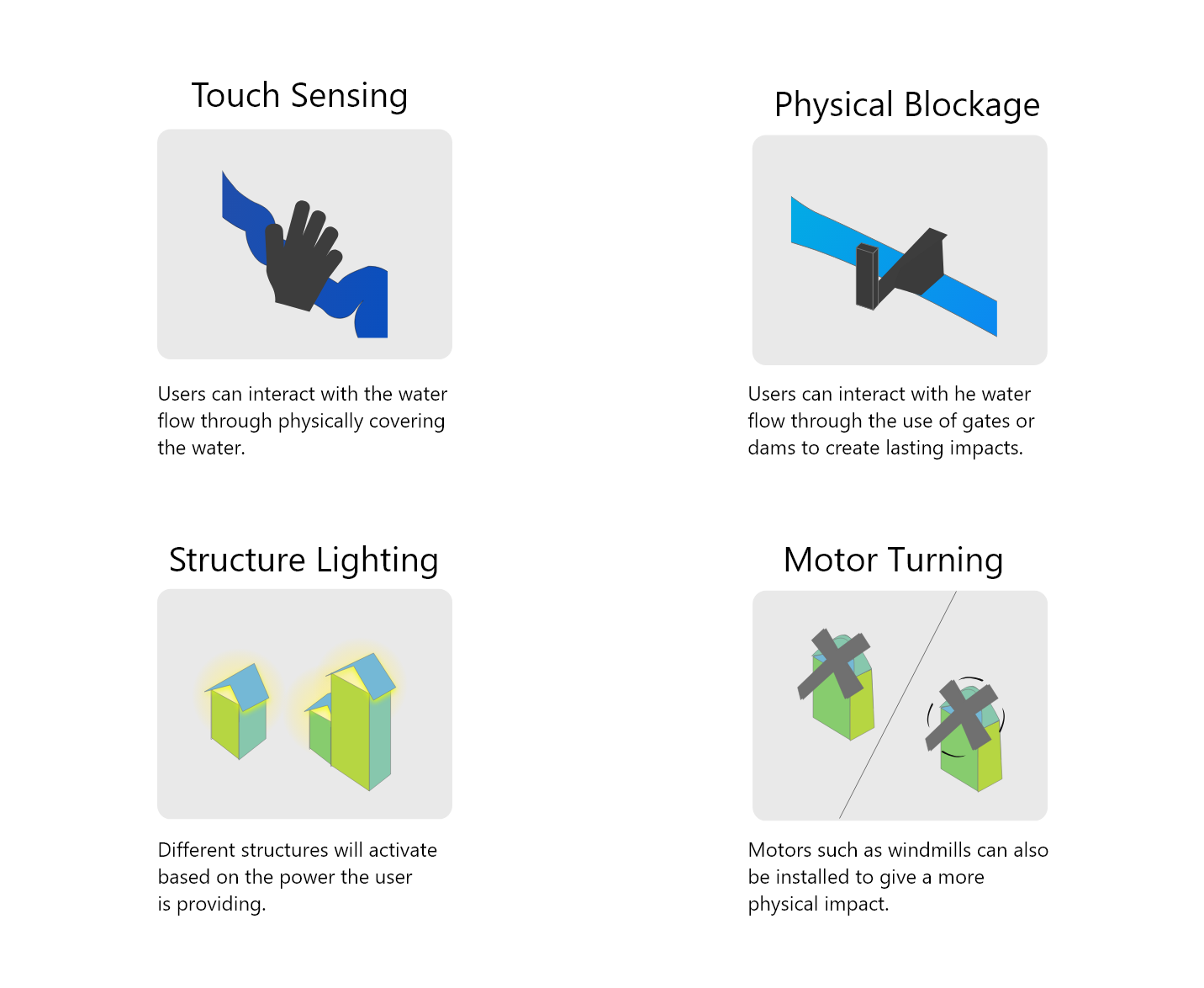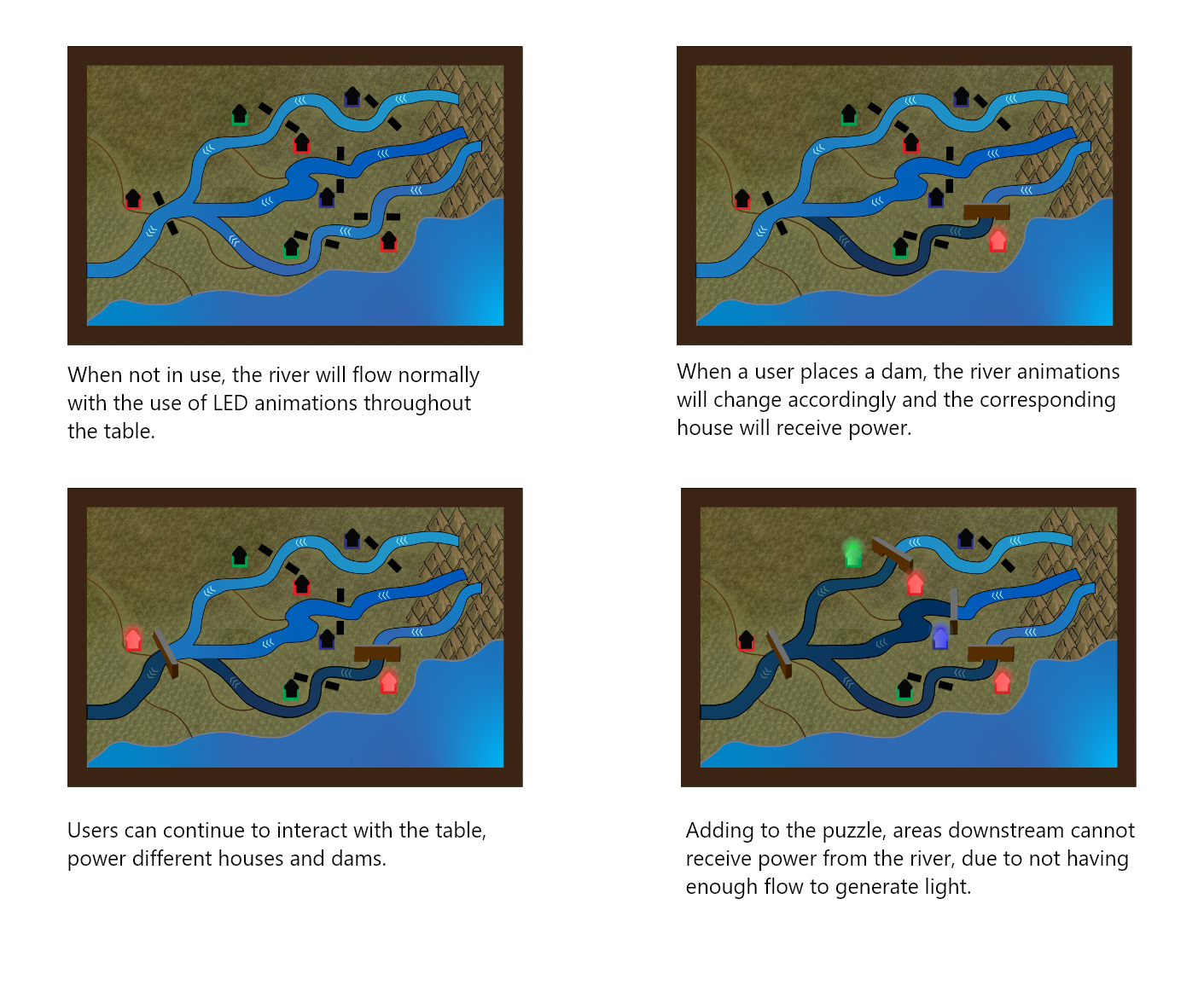 We chose to fully commit to the rivers and maps metaphors and evolved it into powering a series of towns from a limited water source. This allowed us to create a more story and puzzle inspired experience for the children to solve while thinking "why does this work?"