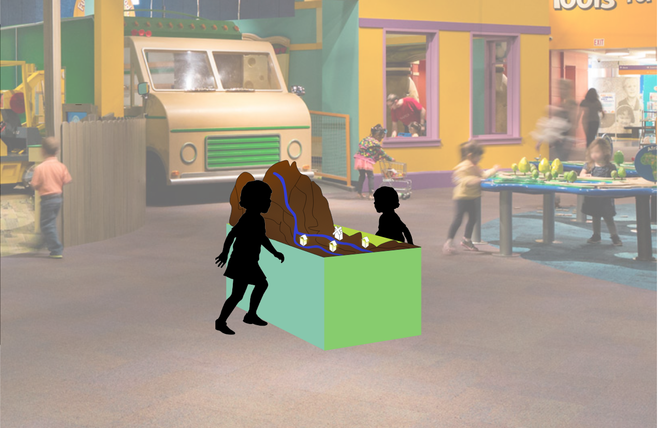 Bringing this model to the children's museum for a 1 hour user testing session with museum attendees, we conducted a modified think aloud session. In this session, we were looking at answering the questions around "How will they interact with this kind of product?" and "What are they expecting out of this installation?". Using these results, we hoped to be able to refine the physical, visual, and digital forms around these interaction answers.