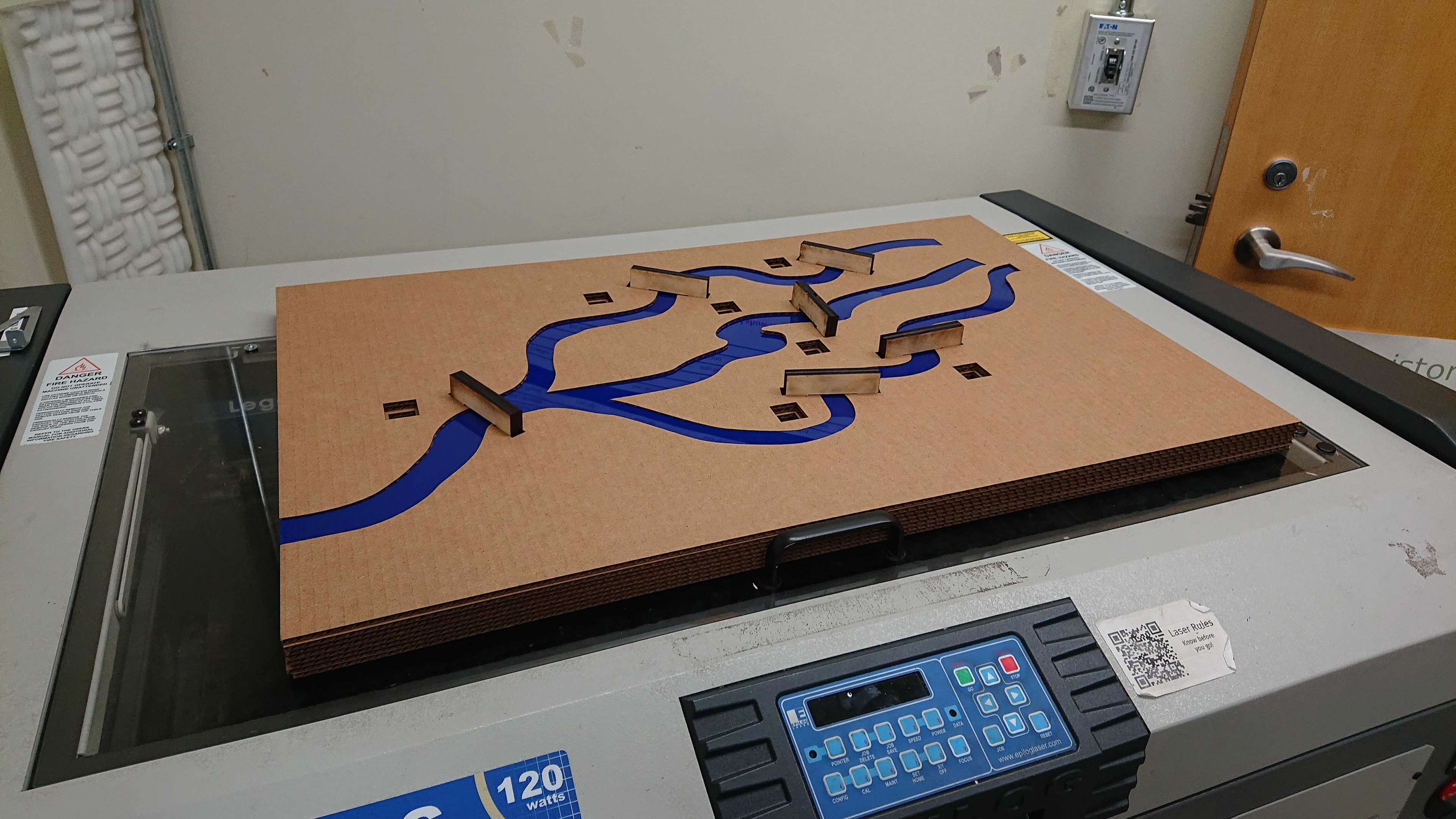 We created a mid-fidelity "acts like" prototype using a plywood and cardboard structure powered by an Arduino and custom touch sensors hidden underneath basic graphics. We used colored acrylic and LED strips for the river animations that acted as the primary output and attract. With this fabrication style, we could easily replace any digital components in future iterations while maintaining the integrity of the physical table and frame.